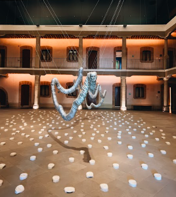 La serpiente de los días es una instalación de Carlos Amorales comisionada para el patio central del museo construida a partir de replicar cientos de veces la forma de una máscara neutral en aluminio y en cerámica. Con las primeras formó una serpiente mitológica (que funciona a su vez, como un gran instrumento de percusión, un metalófono) que flota sobre un mar de máscaras de cerámica distribuidas en el piso. Esta instalación monumental se inspira en la experiencia colectiva de la pandemia de Coronavirus, asumiendo un largo momento de incertidumbre.